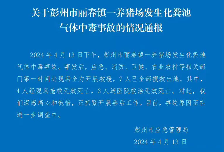 2024年4月13日下午,彭州市麗春鎮一養豬場發生化糞池氣體中毒事故,4人經現場搶救無效死亡,3人送醫院救治無效死亡。據統計,我國每年都會有類似因環境通風條件差導致的氣體中毒事件,只有在養豬場等農牧養殖場所建立良好通風環境避免氣體中毒,才能保證人員的安全和健康。