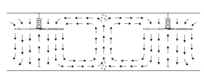 當有多個適當間隔的大型吊扇時,相鄰的氣流流相遇形成壓力區。壓力區就像一堵墻,使得每個吊扇都像一個封閉的風扇。通常,當一臺吊扇與其他風扇一起工作時,它的性能會提高。